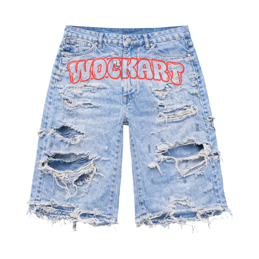 WOCKART DREAMS COLLECTION BAGGY FIT FRONT & BACK DISTRESSED DENIM SHORTS VINTAGE PRINT (ITEM IS MORE DISTRESSED THAN MOCKUP IMAGE)